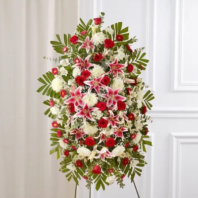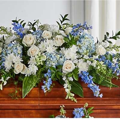 Price: $160.00 Heartfelt Tribute Blue & White Floor Basket Arrangement Product Tags: Same-day Delivery
